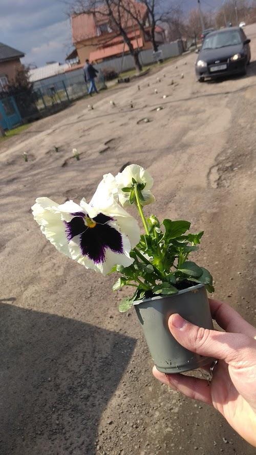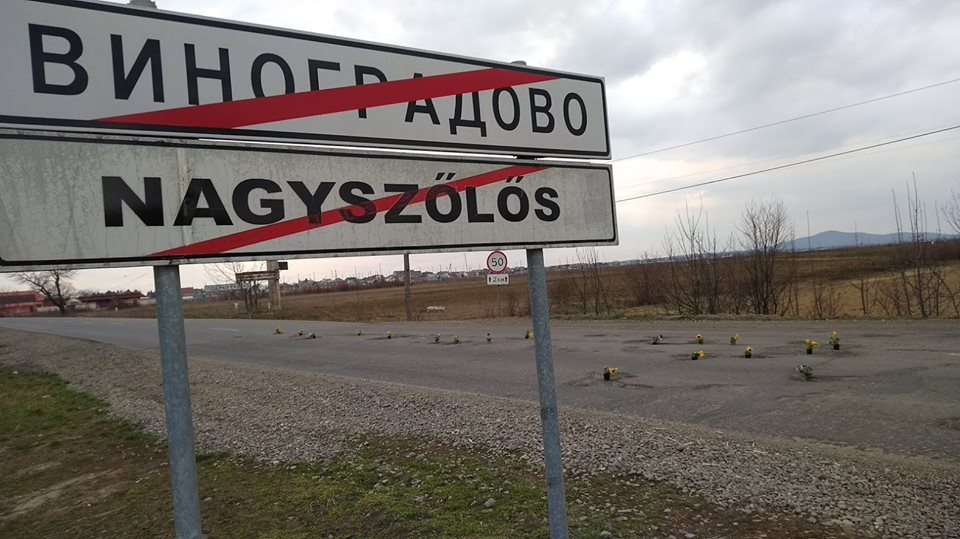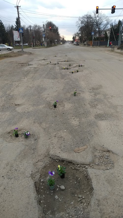 В городе Виноградове Закарпатской области по возможным маршрутам следования кортежа Порошенко в дорожных ямах установили цветы в горшочках. Так жители решили присоединиться к "областному благоустройству" Закарпатья, которое сегодня, 15 марта должен посетить Порошенко.