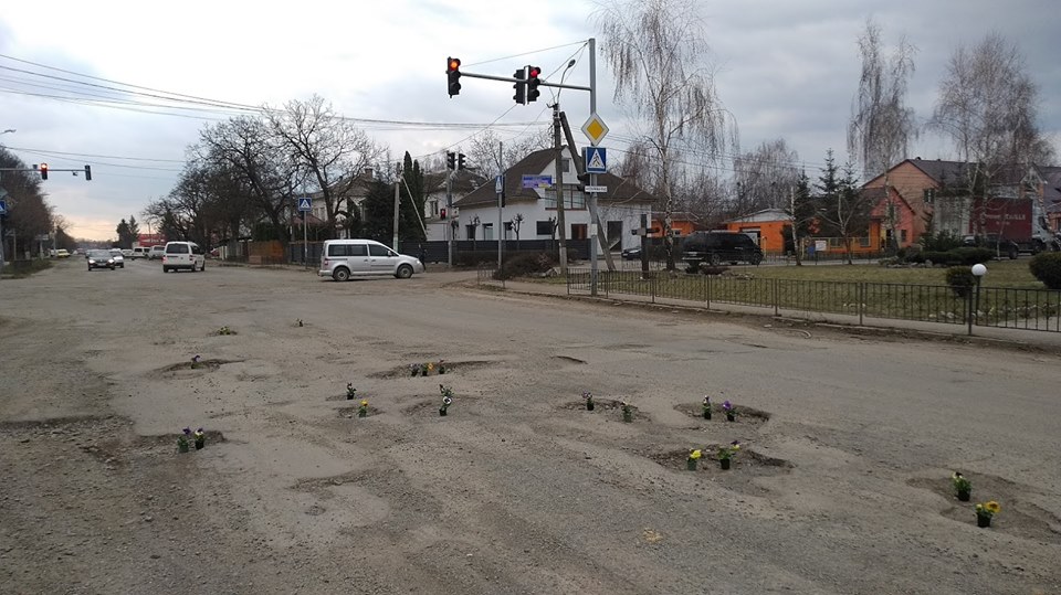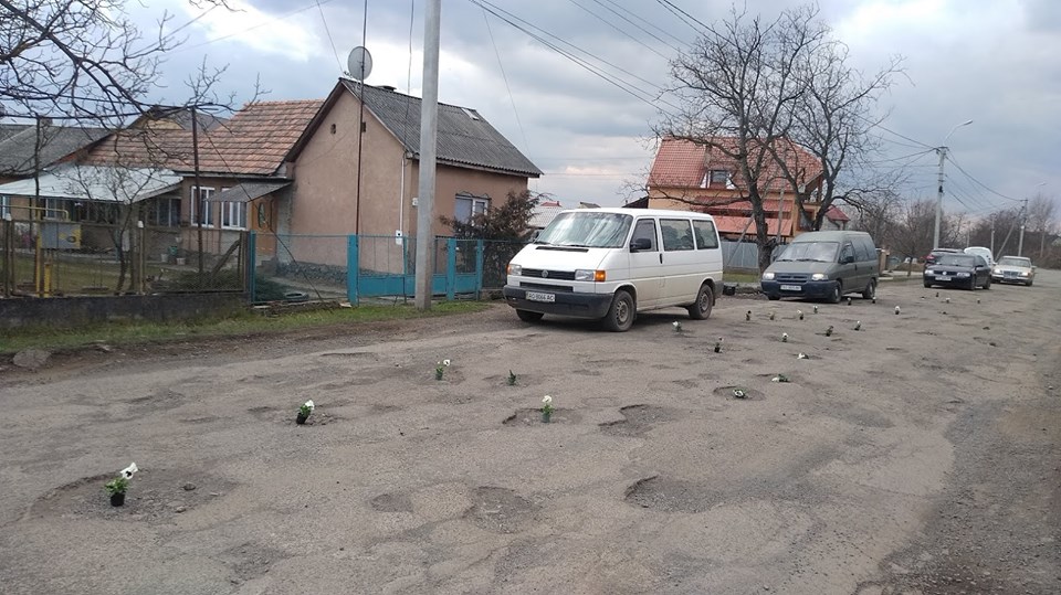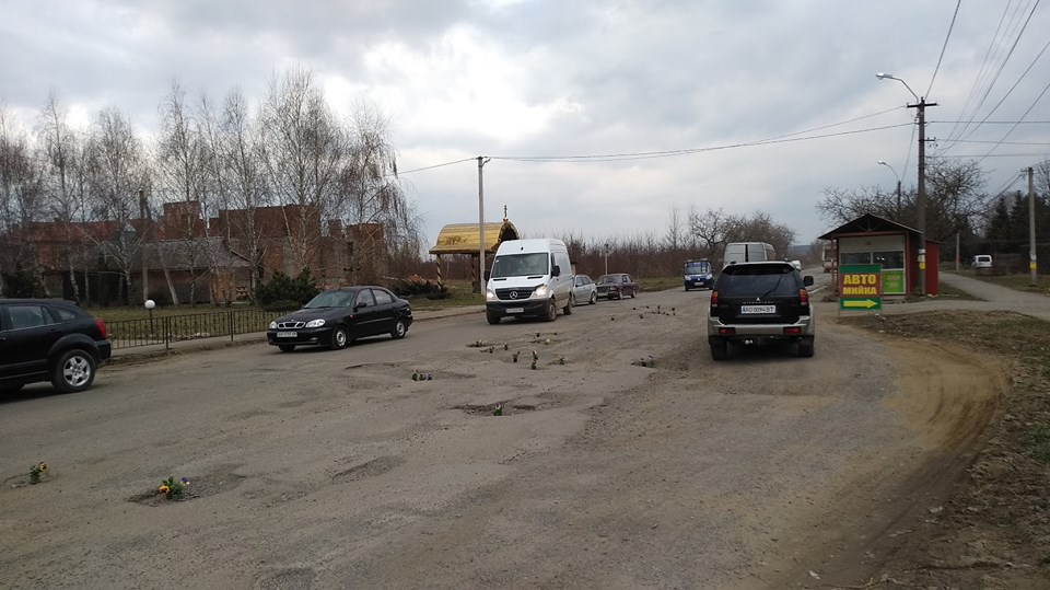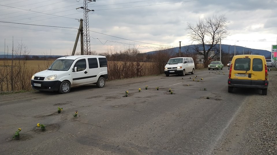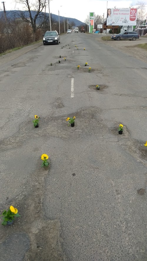 На Закарпатье к приезду Порошенко устроили флешмоб с цветами в дорожных ямах. Фото