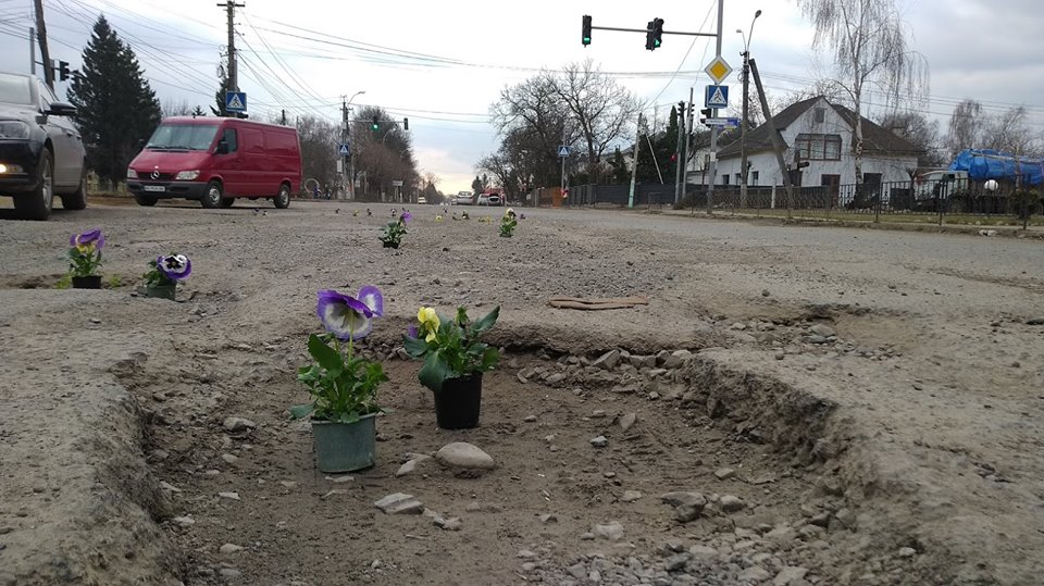 10:38 Президента встречают цветочным флешмобом. На разбитых закарпатских дорогах, по возможному пути следования кортежа, активисты высадили цветы в дорожных ямах. А пока проезжую часть украшают анютины глазки, вдоль маршрута следования кортежа спешно чистят от мусора обочины и ремонтируют мосты. Об этом сообщает "Голос Карпат.ІНФО".