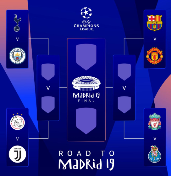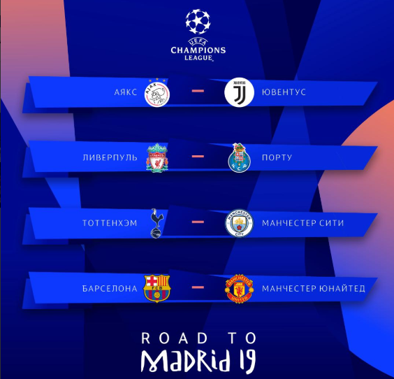 В полуфиналах сыграют победители пары Тоттенхэм - Манчестер Сити и Аякс - Ювентус и пары Барселона - Манчестер Юнайтед и Ливерпуль - Порту.