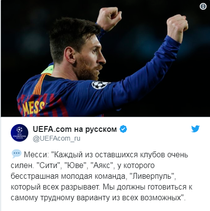 Перед началом жеребьевки Месси высказался о силе команд. "Каждый из оставшихся клубов очень силен. Сити, Юве, Аякс, у которого бесстрашная молодая команда, Ливерпуль, который всех разрывает. Мы должны готовиться к самому трудному варианту из всех возможных", - заявил великий футболист официальному Twitter УЕФА.