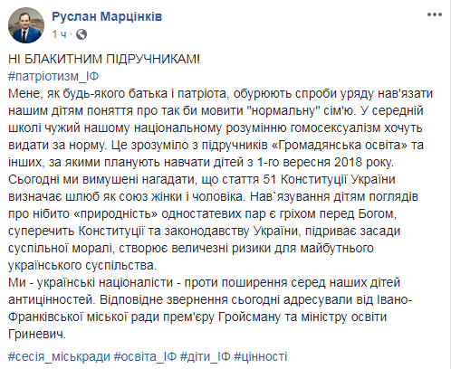 Мы - украинские националисты - против распространения среди наших детей антиценностей. Соответствующее обращение сегодня адресовали от Ивано-Франковского городского совета премьеру Гройсману и министру образования Гриневич", - написал франковский мэр.