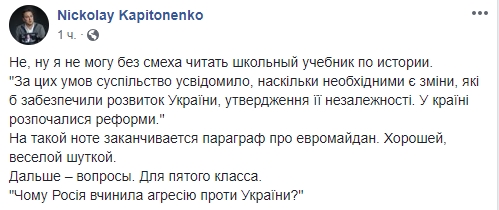 Так, политолог Николай Капитоненко в своем Facebook процитировал некоторые фразы из книги для пятиклассников: