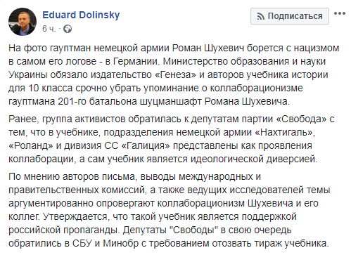 По его словам, ранее группа активистов обратилась к депутатам партии "Свобода" с тем, что в учебнике, подразделения немецкой армии "Нахтигаль", "Роланд" и дивизия СС "Галиция" представлены как проявления коллаборации. Ссылаясь на "выводы международных и правительственных комиссий, а также ведущих исследователей темы", активисты заявили, что Шухевич не был коллаборационистом, а сам учебник "является поддержкой российской пропаганды".