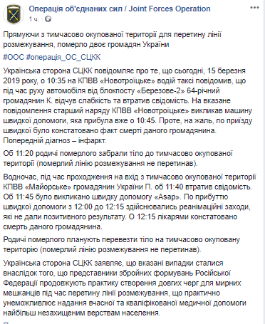 В сообщении говорится о том, что на пункте пропуска "Новотроицкое" таксист сообщил, что его пассажиру стало плохо по дороге от блокпоста "Березовое-2" к подконтрольной Украине территории. К мужчине сразу выехала скорая. Но, так и не доехав до Новотроицкого, мужчина умер от инфаркта. Тело умершего забрали родственники и увезли на временно оккупированные территории.