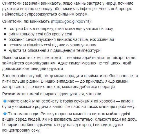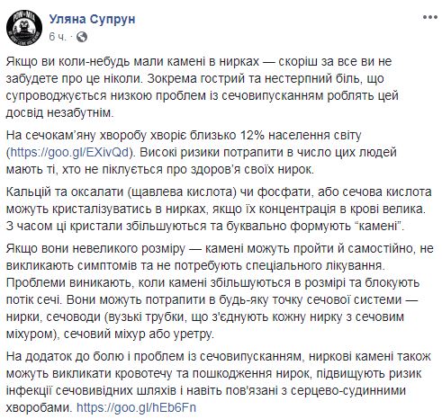 Чтобы уменьшить риски образования почечных камней, необходимо пить много воды. Об этом в Facebook рассказала и.о. министра здравоохранения Украины Ульяна Супрун.