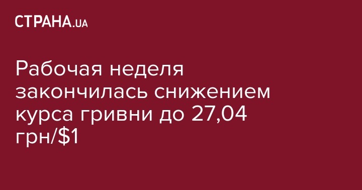 Курс гривни на межбанковском валютном рынке в пятницу снизился до 27,04 грн/$1 с 26,895 грн/$1 в предыдущий рабочий день. Об этом сообщает "Интерфакс-Украина" со ссылкой на дилеров коммерческих банков.