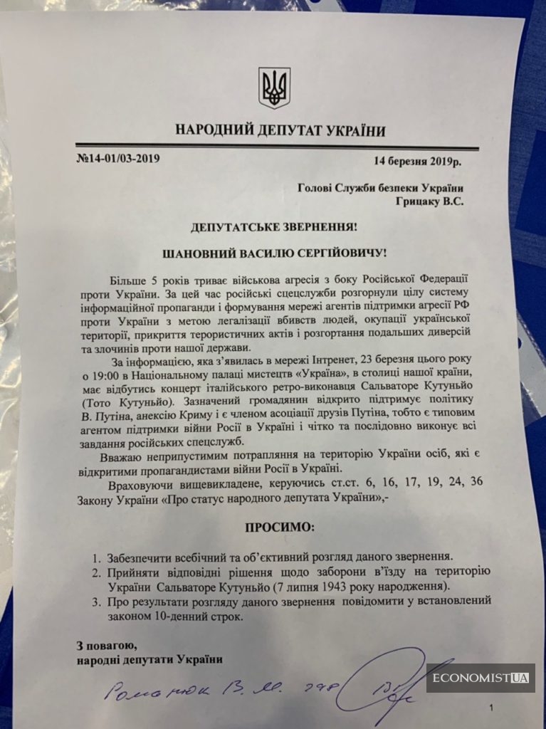 Как удалось узнать журналистам издания EconomistUA, в распоряжении которых оказался соответствующий документ, депутаты считают, что Кутуньо открыто поддерживает политику президента РФ Владимира Путина и аннексию Крыма. Кроме того, он входи в ассоциацию друзей Путина.