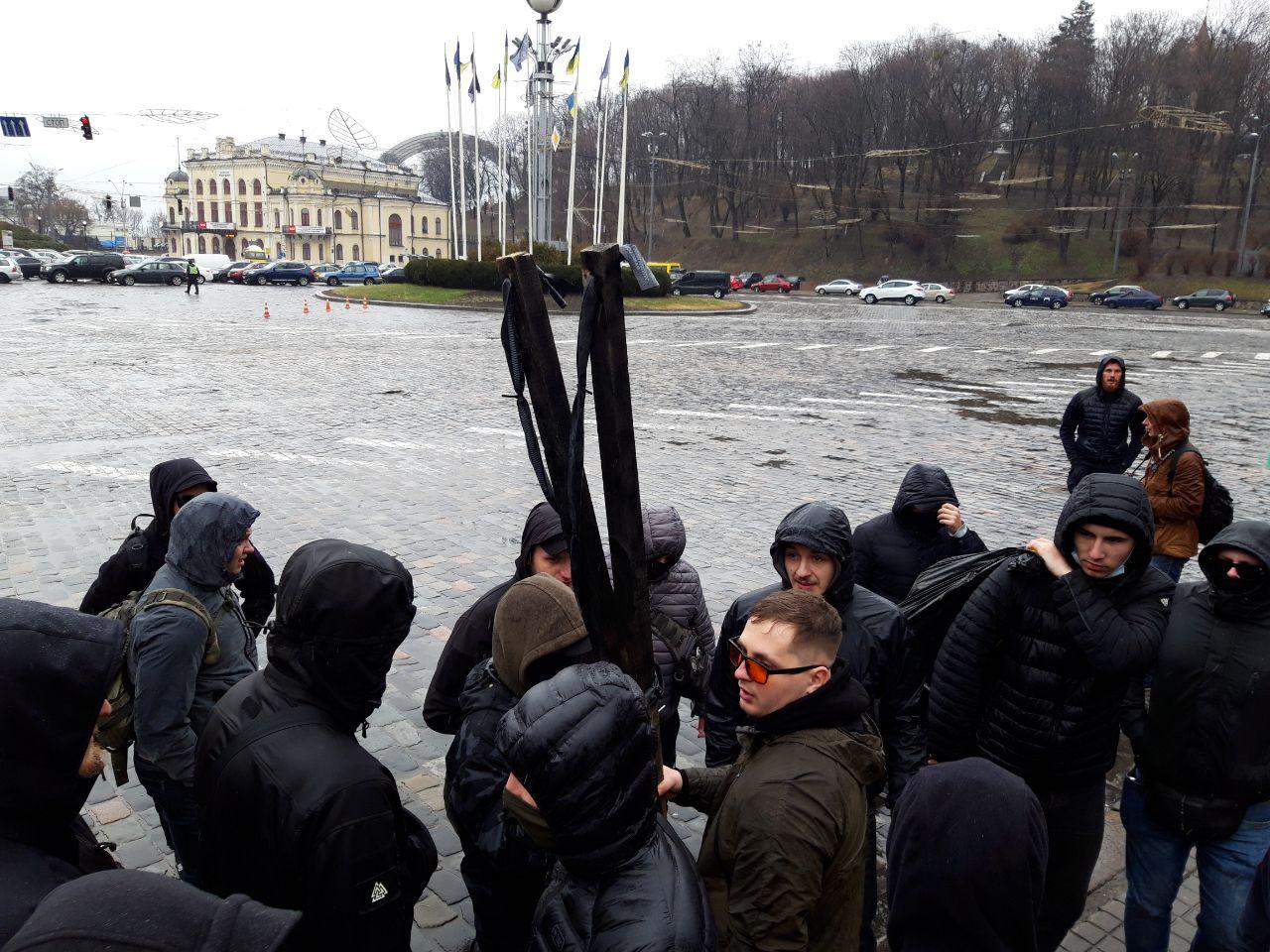 13:36  Часть националистов двинулись по Крещатику к Европейской площади - под Администрацию президента. Туда несут огромную рогатку.