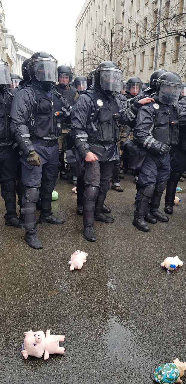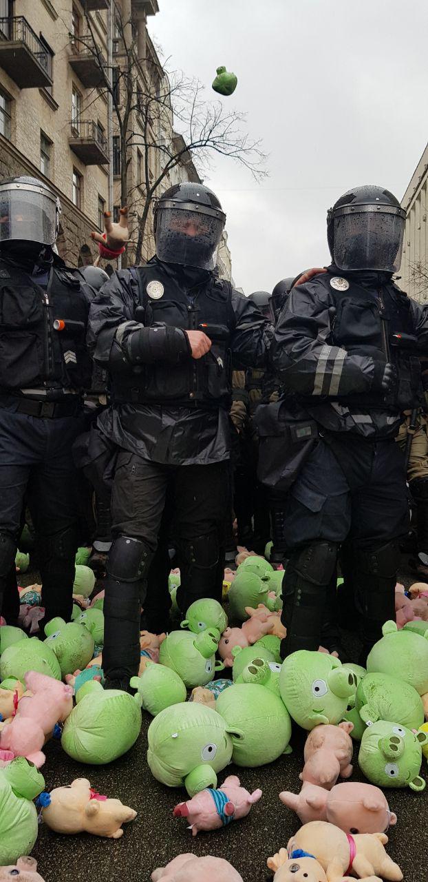 Так как пройти к зданию не получается, активисты решили под музыку из игры Angry Birds стрелять из рогатки свиньями в сторону АП. Также игрушки полетели в полицейских.