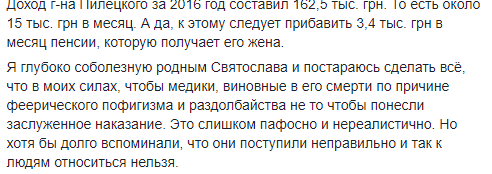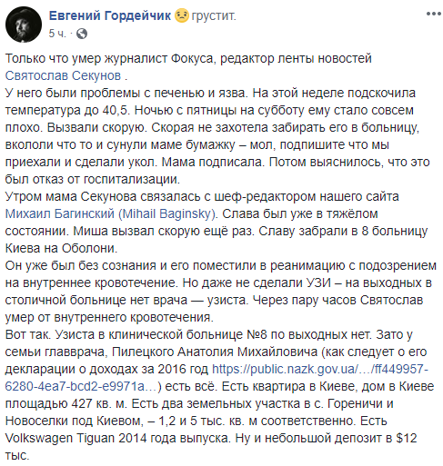 "Он уже был без сознания и его поместили в реанимацию с подозрением на внутреннее кровотечение. Но даже не сделали УЗИ – на выходных в столичной больнице нет врача-узиста. Через пару часов Святослав умер от внутреннего кровотечения", - добавил Гордейчик.