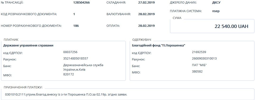 Отмечается, что из этой суммы выплачено 5 460 гривен налогов и сборов. Оставшиеся 22 540 гривен перечислены в соответствии с заявлением Порошенко в определенный им благотворительный фонд.