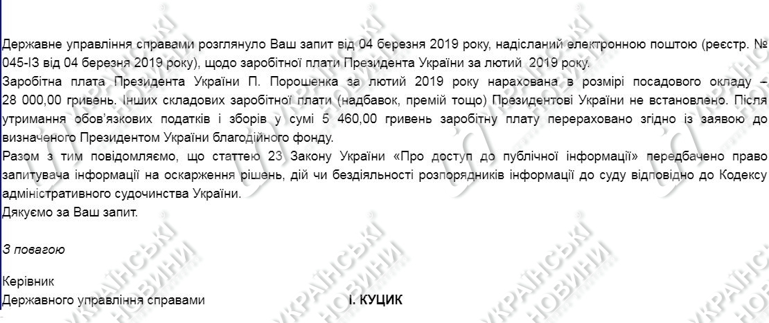 "Заработная плата Президента Украины Петра Порошенко за февраль 2019 начислена в размере должностного оклада - 28 000 гривен. Других составляющих заработной платы (надбавок, премий и т.д.) Президенту Украины не установлено", - сообщили в Государственном управлении делами.