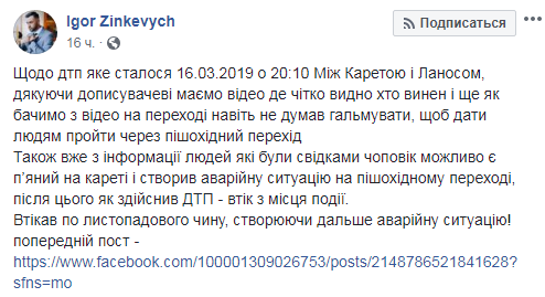 Об этом говорится на Facebook-странице депутата Львовского горсовета Игоря Зинкевича. Он является координатором ГО Варта-1, которая сотрудничает с правоохранителями.