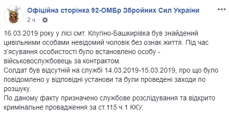 На странице 92-й отдельной механизированной бригады в Facebook подтвердили смерть военнослужащего-контрактника, тело которого было найдено 17 марта в лесу села Клугино-Башкировка Чугуевского района Харьковской области.