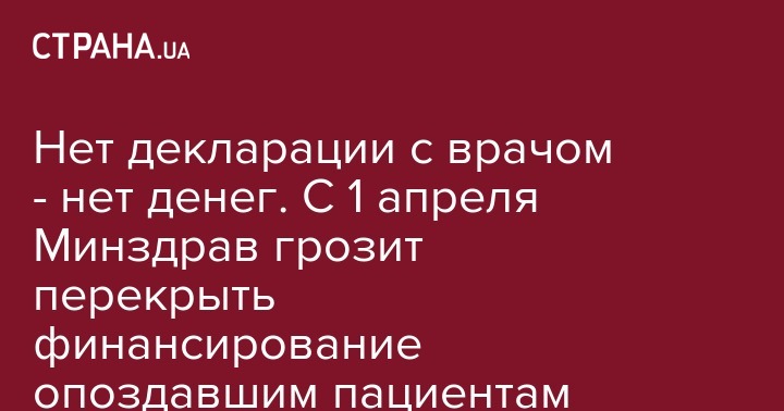 С 1 апреля Минздрав Украины собирается прекратить полное финансирование пациентов, которые еще не заключили деклараций с врачом. Стало известно, почему чиновники идут на такой шаг и чем это грозит для украинцев, пишет "Сегодня".