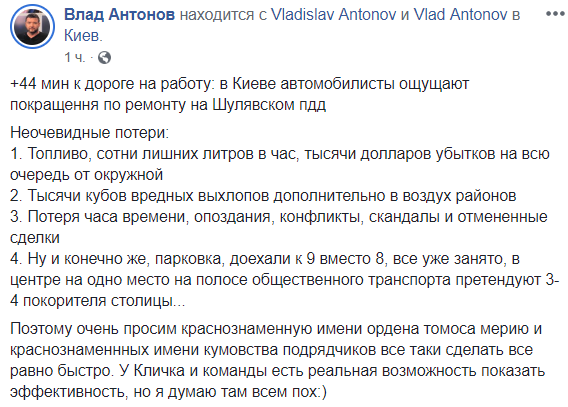 Поэтому очень просим краснознаменную имени ордена томоса мэрию и краснознаменнных имени кумовства подрядчиков все таки сделать все равно быстро. У Кличка и команды есть реальная возможность показать эффективность, но я думаю там всем пох:)", - пишет автомобильный журналист Владислав Антонов.