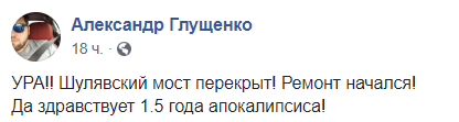 "Шулявский мост перекрыт! Ремонт начался! Да здравствует 1.5 года апокалипсиса!", - пишет чиновник Нацрады по телерадиовещанию Александр Глущенко.