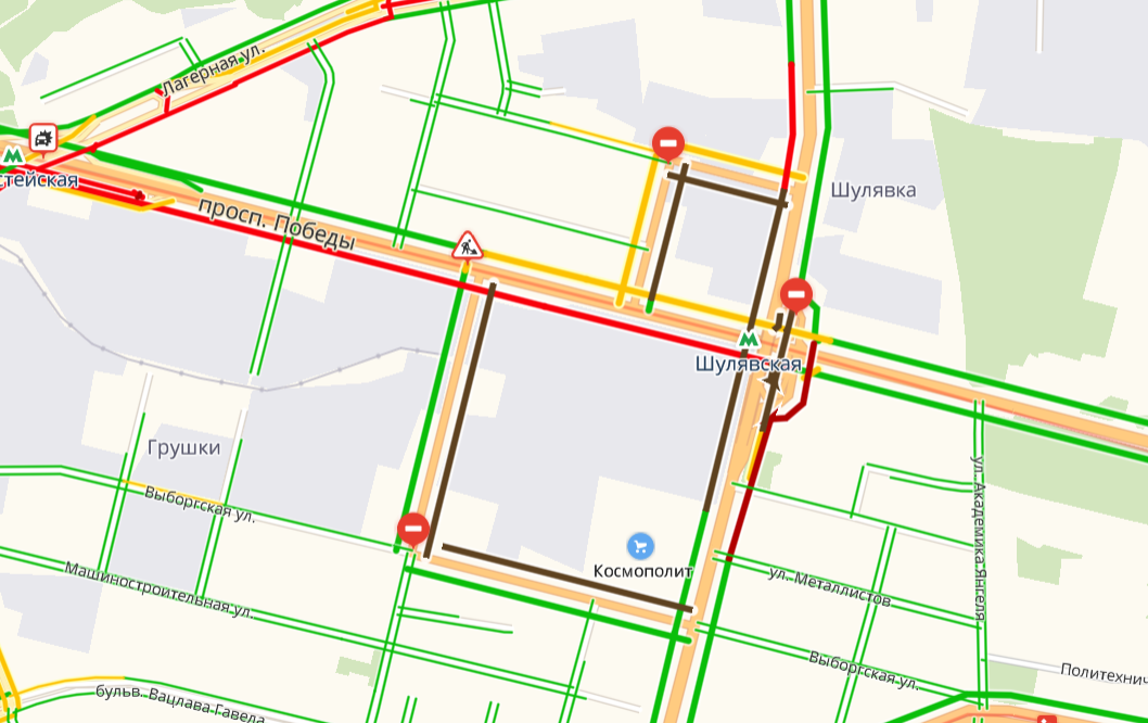 Улица Елены Телиги. Тем, кто едет ул. Елены Телиги в сторону Индустриального моста следует приготовиться к многоступенчатому объезду со многими светофорами: по ул. Антона Цедика, ул. Нестерова (ее сделали односторонней), пр. Победы, ул. Гарматной и ул. Выборгской. Проделав этот путь, вы выедете на ул. Вадима Гетьмана за ТРЦ "Космополит".