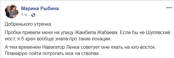 "Пробки привели меня на улицу Жамбила Жабаева. Если бы не Шулявский мост, я б хрен вообще знала про такие локации", - пишет журналистка Марина Рыбина.