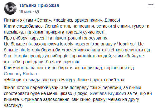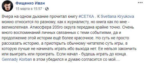 "Вчера на одном дыхании прочитал книгу "#СЕТКА". К Светлане Kрюковой можно относится по-разному как к журналисту, но книга, как по мне, – великолепная. Атмосфера 205-го округа передана крайне точно. Очень много воспоминаний личных, связанных с теми событиями, да и продолжение этой истории еще более красочное. Но суть не просто рассказать историю, а приоткрыть обычному читателю суть игры, в которую лучше не начинать играть, ибо выхода нет. Ее нельзя закончить или выиграть или проиграть. Если начал – будешь играть до конца. Геннадий Корбан в этом убедился, и, думаю, согласится со мой..." – написал член партии УКРОП Иван Фищенко.