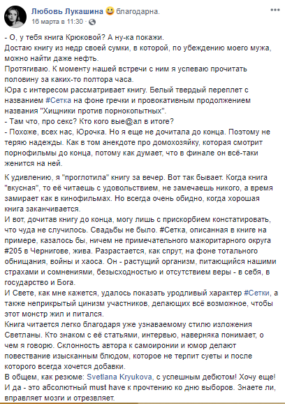 "Встречайте книгу #Сетка Светланы Крюковой. Я, в некотором смысле, стоял у истоков этого произведения, так как я – именно тот человек, который отправил Свету в редакционную командировку в Чернигов летом 2015 года. Мы планировали сделать хороший жизненный репортаж о выборах по мажоритарному округу. А в итоге нам обоим пришлось покинуть медиахолдинг, где работали, и вместе запустить новый проект: интернет-газету "Страна". А из командировки получилась книга, которую вы и держите сейчас в ваших руках. У нее есть много достоинств, но я бы отметил прежде всего два.
