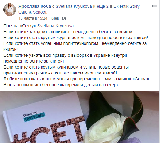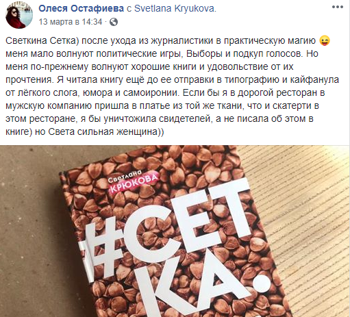 "Светкина Сетка) после ухода из журналистики в практическую магию меня мало волнуют политические игры, выборы и подкуп голосов. Но меня по-прежнему волнуют хорошие книги и удовольствие от их прочтения. Я читала книгу еще до ее отправки в типографию и кайфанула от легкого слога, юмора и самоиронии. Если бы я в дорогой ресторан в мужскую компанию пришла в платье из той же ткани, что и скатерти в этом ресторане, я бы уничтожила свидетелей, а не писала об этом в книге) но Света сильная женщина))" – рассказала основатель "Відьма-бар Лиса Гора" Олеся Остафиева.