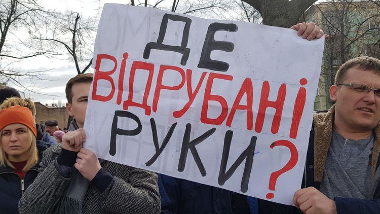 На митинг пришла группа активистов с плакатом "Де відрубані руки" и вспоминавших Иловайский котел в АТО. К ним мгновенно пришла полиция диалога, после окружили правоохранители и вывели из толпы.