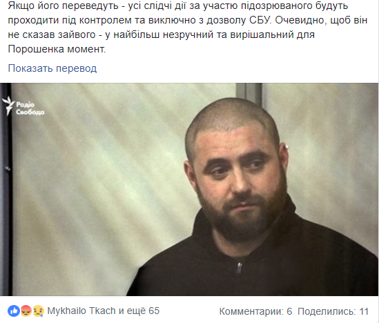 "Если его переведут - все следственные действия с участием подозреваемого будут проходить под контролем и исключительно с разрешения СБУ. Очевидно, чтобы он не сказал лишнего - в самый неудобный и решающий для Порошенко момент", - заключает журналист.