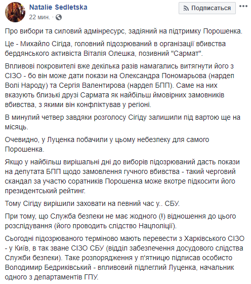 "Если в наиболее решающие дни до выборов подозреваемый даст показания на депутата БПП по заказу громкого убийства - такой очередной скандал с участием соратников Порошенко может в очередной раз подкосить его президентский рейтинг. Поэтому Сигиду решили спрятать на время в .. СБУ. При том, что Служба безопасности не имеет ни одного (!) отношения к этому расследованию (его проводит следствие Нацполиции)", - написала Наталья Седлецкая.