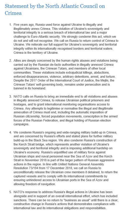 В частности, в НАТО призывают Россию отпустить всех украинских политических заключенных, а также прекратить насильно раздавать жителям полуострова российское гражданство. Также в блоке осуждают наращивание российской военной группировки, строительство Крымского моста и арест украинских моряков из-за инцидента в Керченском проливе в ноябре 2018-го.