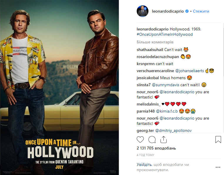 В интернете был опубликован первый постер к новому фильму режиссера Квентина Тарантино "Однажды в Голливуде". Снимок плаката разместил в своем Instagram исполнитель одной из главных ролей Леонардо Ди Каприо.
