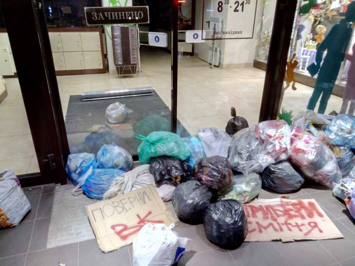 17 мая во Львове забросали мешками с мусором магазин "Рошен". Свои требования неизвестные написали на кусках картона, которые бросили там же. Требования было два - вернуть "Вконтакте" и убрать мусор.