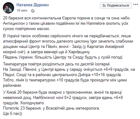 В среду, 20 марта, антициклон Hannelore охватит всю континентальную Европу и подарит ее жителям солнце и синее небо, а вот в Украине обстановку подпортит циклон Igor. Об этом написала синоптик Наталья Диденко на своей странице в Facebook.