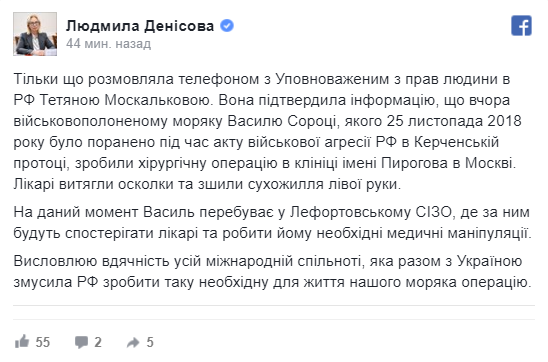 Ее российская коллега Татьяна Москалькова подтвердила, что операцию военнопленному моряку Василию Сороке провели 18 марта. Тогда как ранили парня еще 25 ноября 2018 года. Ему сделали хирургическую операцию в клинике имени Пирогова в Москве. Врачи извлекли осколки и сшили сухожилия левой руки.