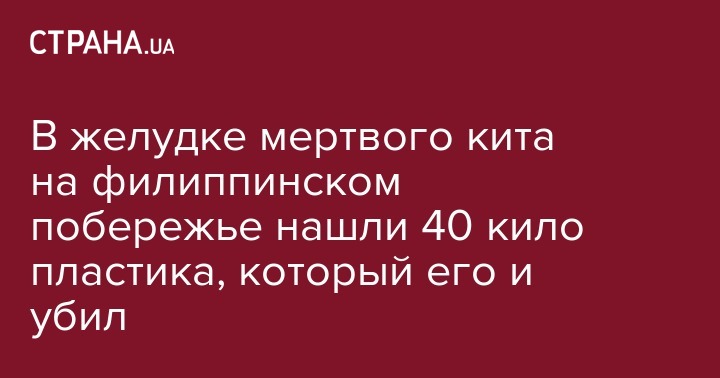 Сотрудники частного музея, нашедшие на филиппинском побережье мертвого клюворыла, животное из отряда китообразных, обнаружили в его желудке 40 килограммов пластика - по крайней мере 16 мешков для риса и множество пластиковых пакетов. Об этом рассказывает телерадиокомпания BBC.