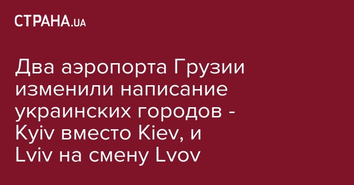 "В международных аэропортах Тбилиси и Батуми изменили правописание украинских городов. Речь идет о транскрипции названий городов латинскими буквами. По пояснению украинской стороны, до сих пор во время написания названий городов латинскими буквами названия некоторых городов писали по русской транскрипции, что уже исправили по всем официальным каналам", - сообщает издание.