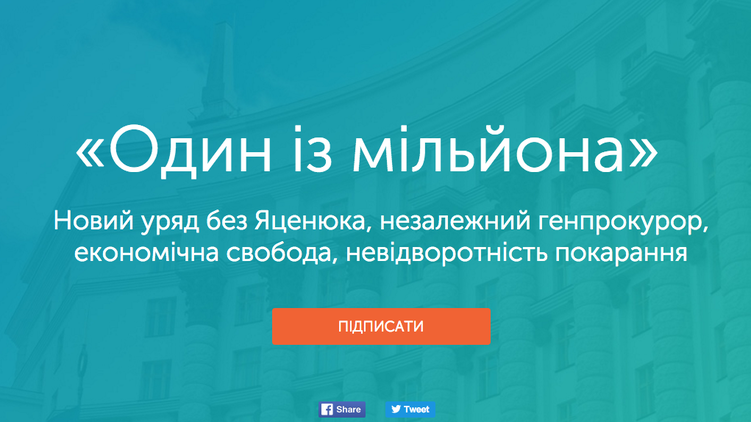 Так, сегодня на сайте акции “Один из миллиона” начался инициированный "Рухом" сбор подписей за отставку премьер-министра Арсения Яценюка, назначение независимого Генпрокурора, принятие законов об экономической свободе, неотвратимость наказания коррупционеров и новое избирательное законодательство.