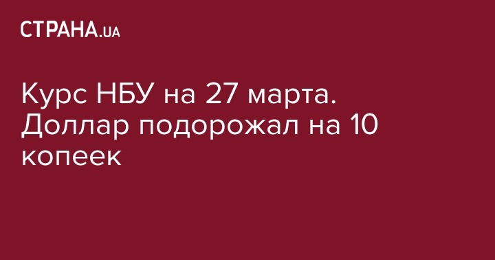 В среду, 27 марта, Национальный банк Украины установил официальный курс основных валют по отношению к гривне. Доллар, по сравнению с предыдущим банковским днем подорожал на 10 копеек. Об этом свидетельствуют данные, размещенные на официальном сайте регулятора.