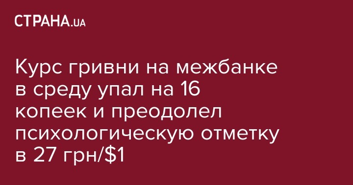 Курс гривни на межбанке в среду упал на 16 копеек и преодолел психологическую отметку в 27 грн/$1