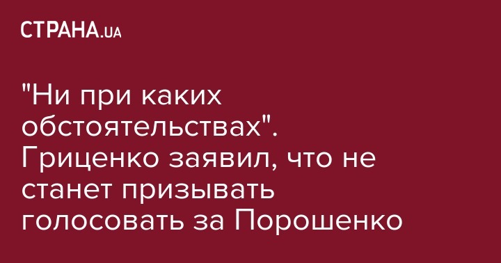 Кандидат в президенты Украины, лидер партии "Гражданская позиция" Анатолий Гриценко заявил, что ни при каких обстоятельствах не поддержит во втором туре кандидата в президенты Петра Порошенко. Также он заявил, что не может призывать голосовать и за кандидата в президенты Владимира Зеленского.