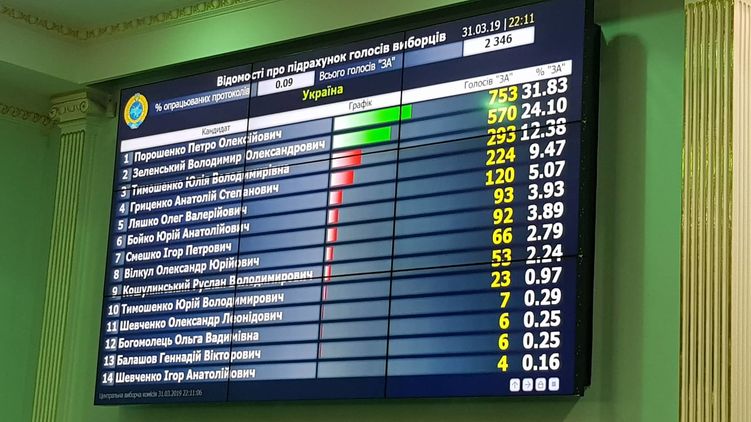 В ЦИК огласили первые результаты первого тура президентских выборов-2019. После подсчета 0,09% (девяти сотых процента) всех голосов, лидирует текущий президент Петр Порошенко с показателем 31,83%, второе место - у Владимира Зеленского (24,10%), третье - у Юлии Тимошенко (12,38%).