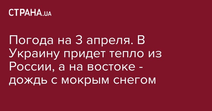 В восточной части Украины ожидается дождь и мокрый снег, на остальной территории без осадков. Ветер северо-восточный, на западе – юго-восточный, 7-12 м/с. Температура ночью от +1° до -4°, днем +6...+11°, в восточных областях +3...+5°, на Закарпатье ночью +2...+7° тепла, днем +12...+15°.