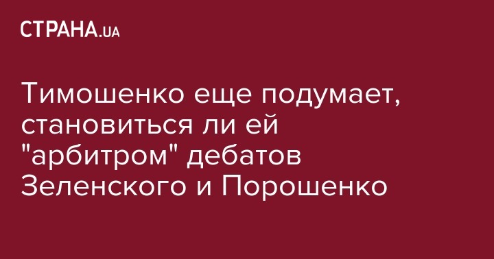 Лидер партии "Батькивщина" Юлия Тимошенко еще не решила, будет ли участвовать в дебатах между кандидатами в президенты Владимиром Зеленским и Петром Порошенко. Об этом сообщили в пресс-службе команды Тимошенко, передает Громадське.