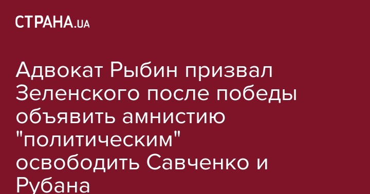 В редакцию "Страны" поступило открытое письмо адвоката Валентина Рыбина, которое он адресуют "будущему президенту Украины" Владимиру Зеленскому. В послании Рыбин призывает его в качестве "первых шагов на посту Гаранта" освободить всех политзаключенных, которые были "участниками гражданского противостояния 2014 - 2019 годов", обменять всех пленных и поручить контроль над этим процессом Надежде Савченко и Владимиру Рубану, дело которых до сих пор рассматривается в судах