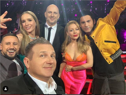 Она обнародовала фото с другими тренерами на шоу Потапом, Mонатиком, Dan Balan и ведущими Юрием Горбуновым и Катей Осадчей.