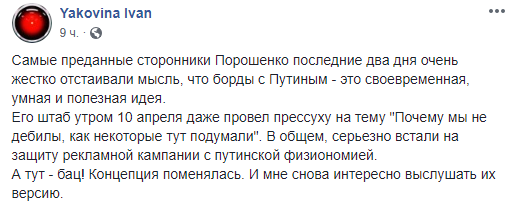 "Самые преданные сторонники Порошенко последние два дня очень жестко отстаивали мысль, что борды с Путиным - это своевременная, умная и полезная идея. Его штаб утром 10 апреля даже провел прессуху на тему "Почему мы не дебилы, как некоторые тут подумали". В общем, серьезно встали на защиту рекламной кампании с путинской физиономией. А тут - бац! Концепция поменялась. И мне снова интересно выслушать их версию", - написал Иван Яковина.