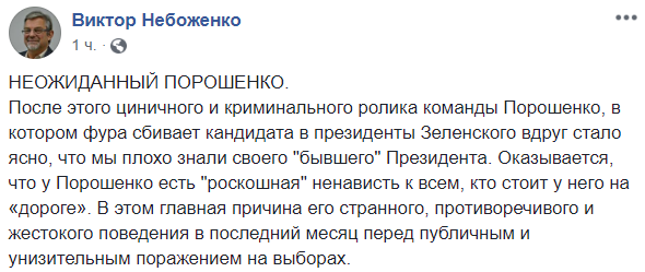 "После этого циничного и криминального ролика команды Порошенко, в котором фура сбивает кандидата в президенты Зеленского вдруг стало ясно, что мы плохо знали своего "бывшего" Президента. Оказывается, что у Порошенко есть "роскошная" ненависть к всем, кто стоит у него на "дороге". В этом главная причина его странного, противоречивого и жестокого поведения в последний месяц перед публичным и унизительным поражением на выборах".