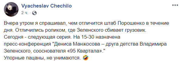 "Вчера утром я спрашивал, чем отличится штаб Порошенко в течение дня. Отличились роликом, где Зеленского сбивает грузовик.