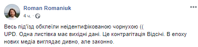 "Весь подъезд обклеили неидентифицированной чернухой. UPD. Одна листовка имеет выходные данные. Это контрагитация Видсичи. В эпоху новых медиа выглядит странно, но законно", - написал журналист Роман Романюк.